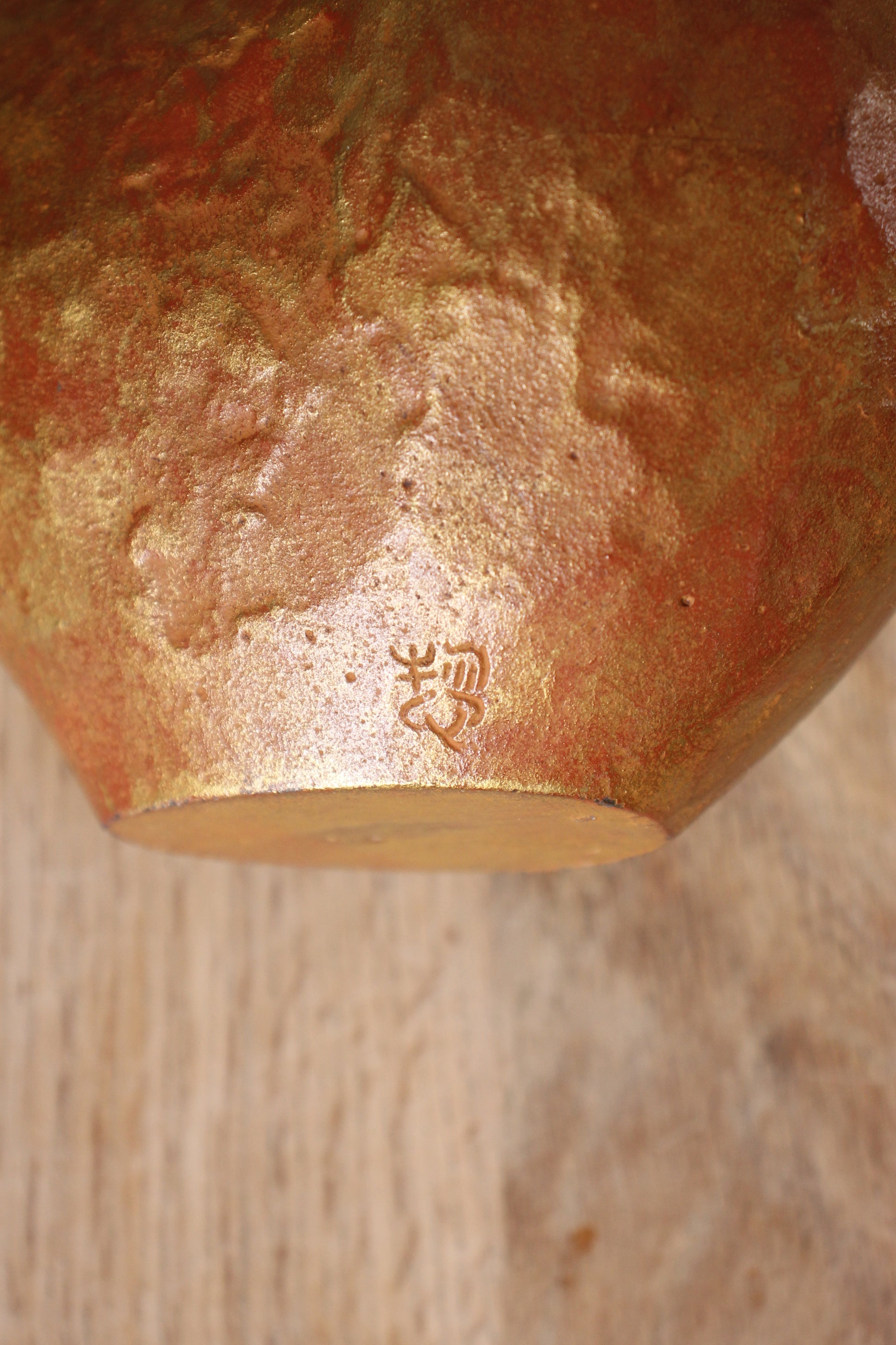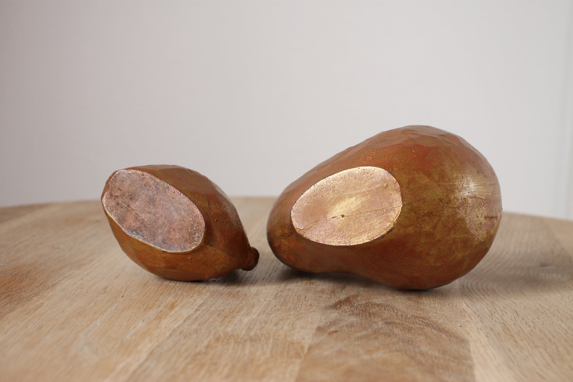 A pair of vintage Japanese cast-iron sculptures of rabbits by Saegusa Sotaro (1911-2006). The surface has a golden-orange finish. The larger sculpture bears the artist’s seal.