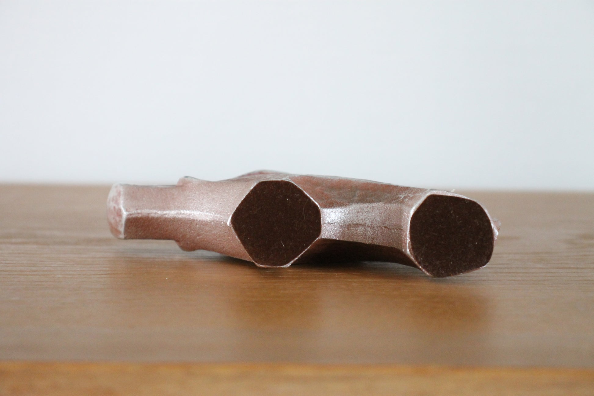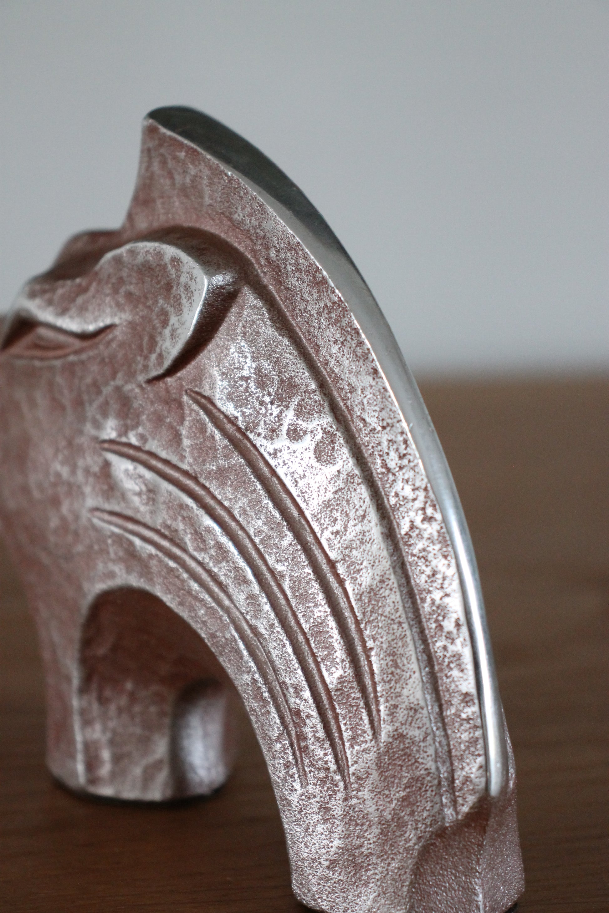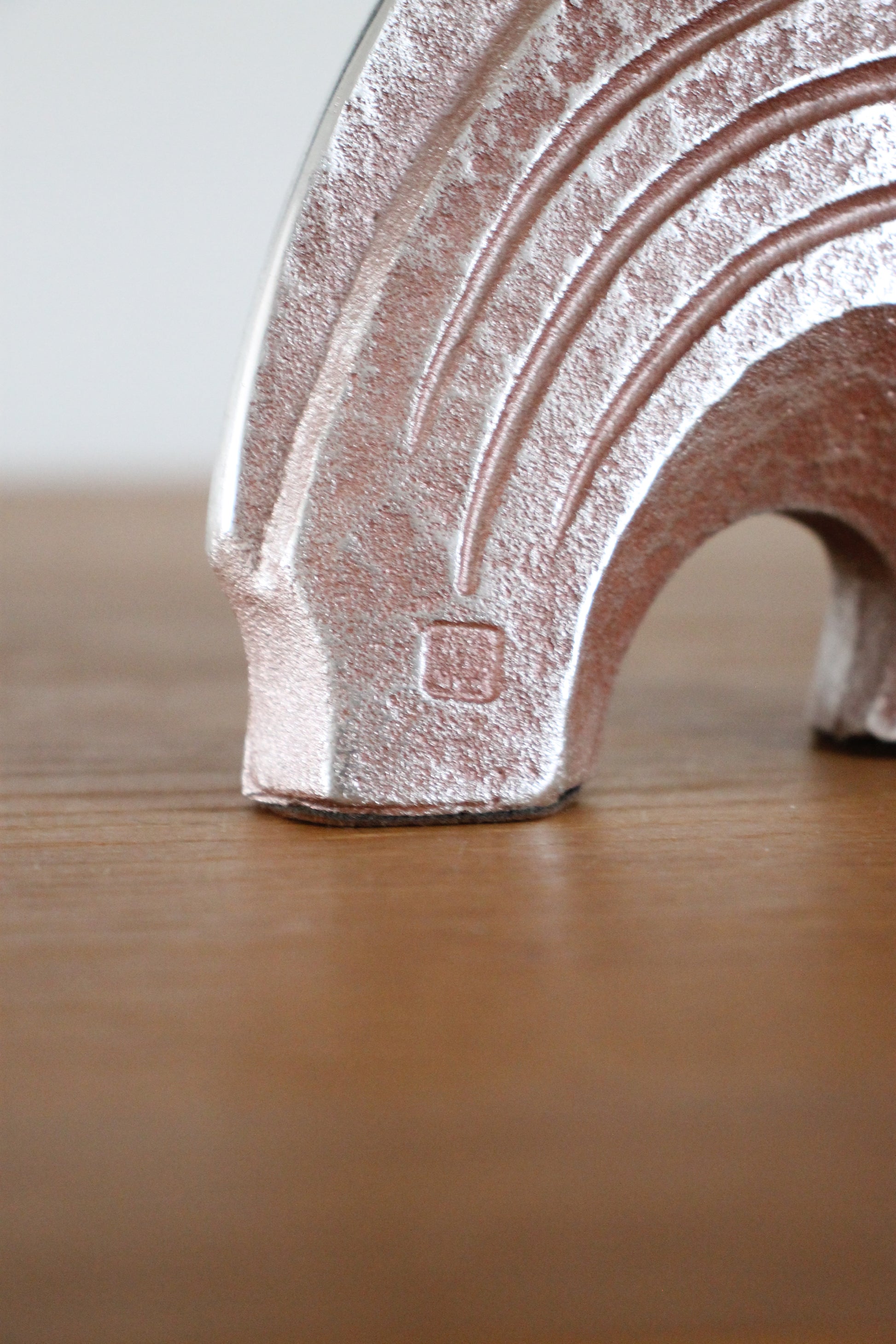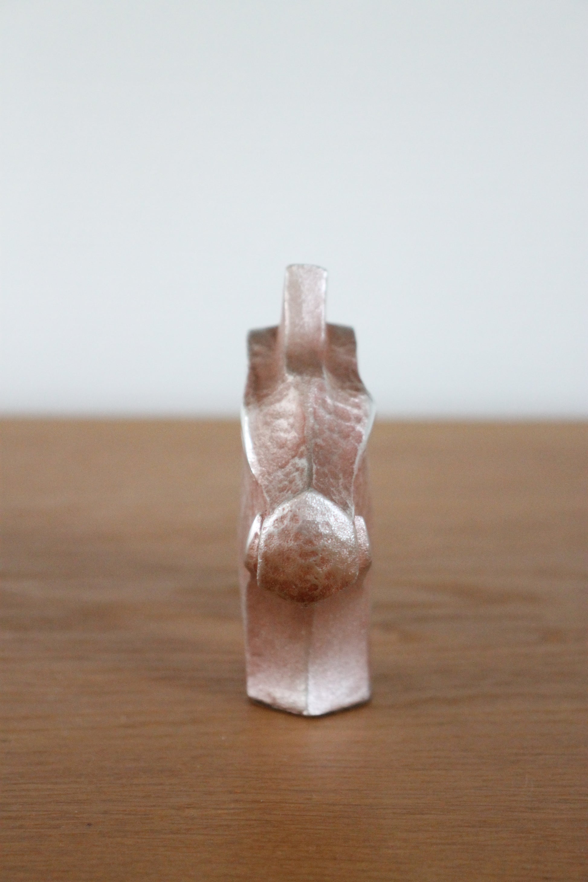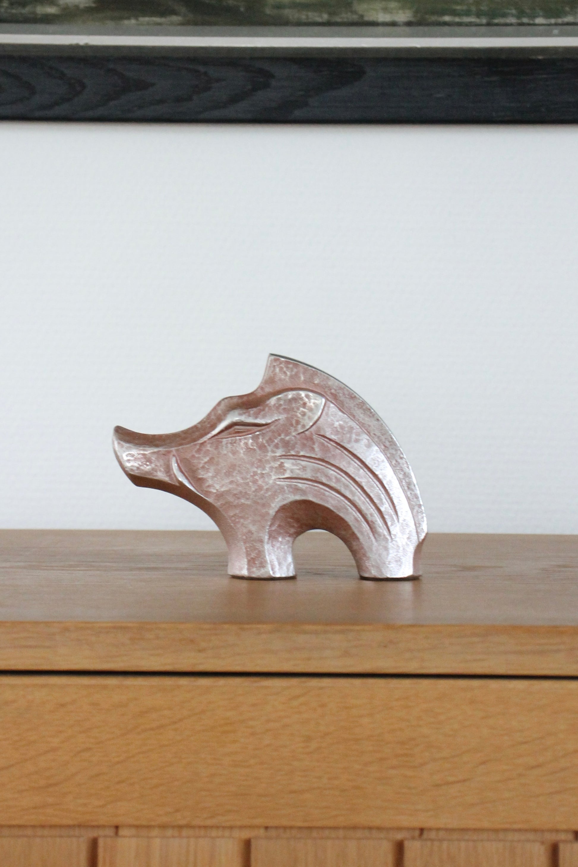 A vintage Japanese bronze sculpture of a boar by Kobayashi Shomin (1912–1994). The surface has a hammered reddish silver. Marked with the artist's seal.