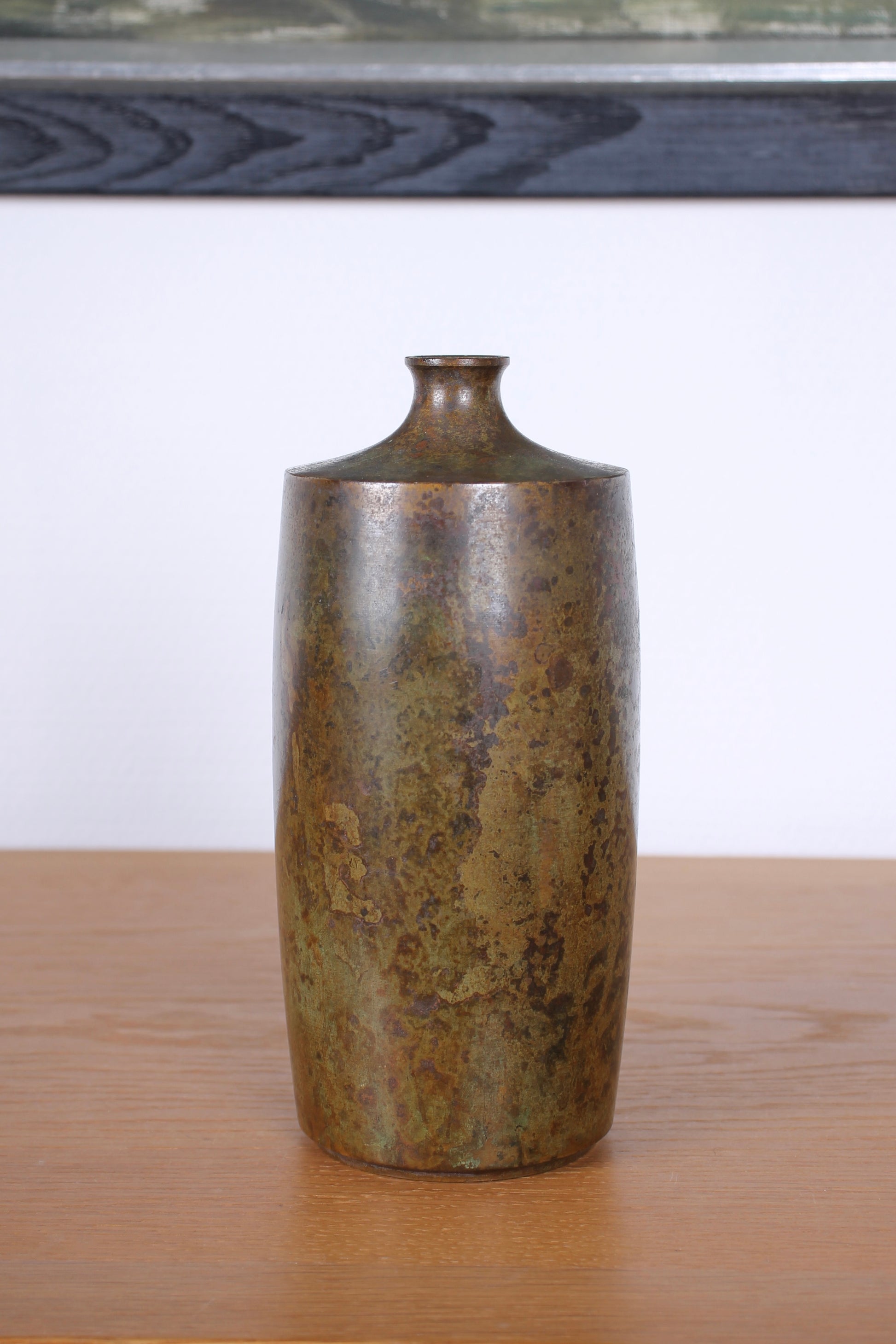 A vintage Japanese bronze vase with a tall cylindrical body rising to a gently sloped shoulder and a short, narrow neck. The surface shows a richly varied patina with tones of bronze brown, deep gold, and darker mottled areas. Marked by the artist's seal on the base.
