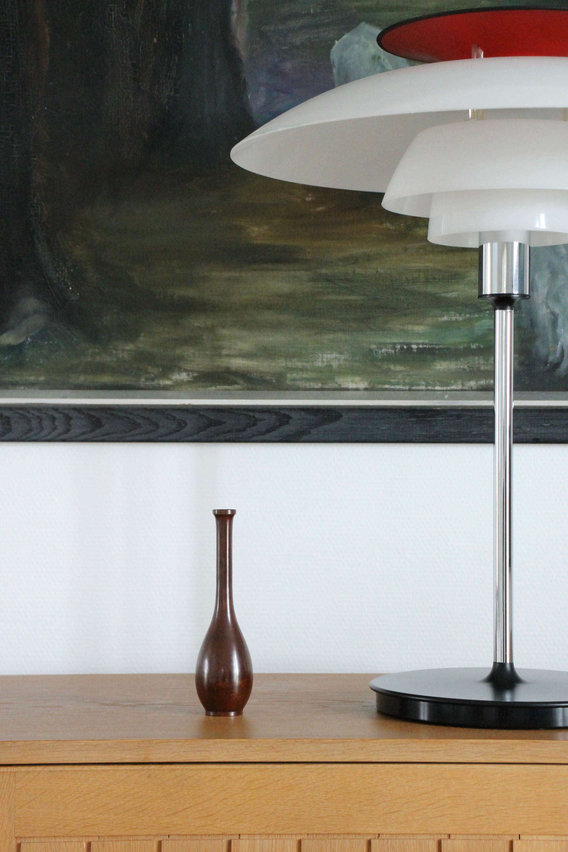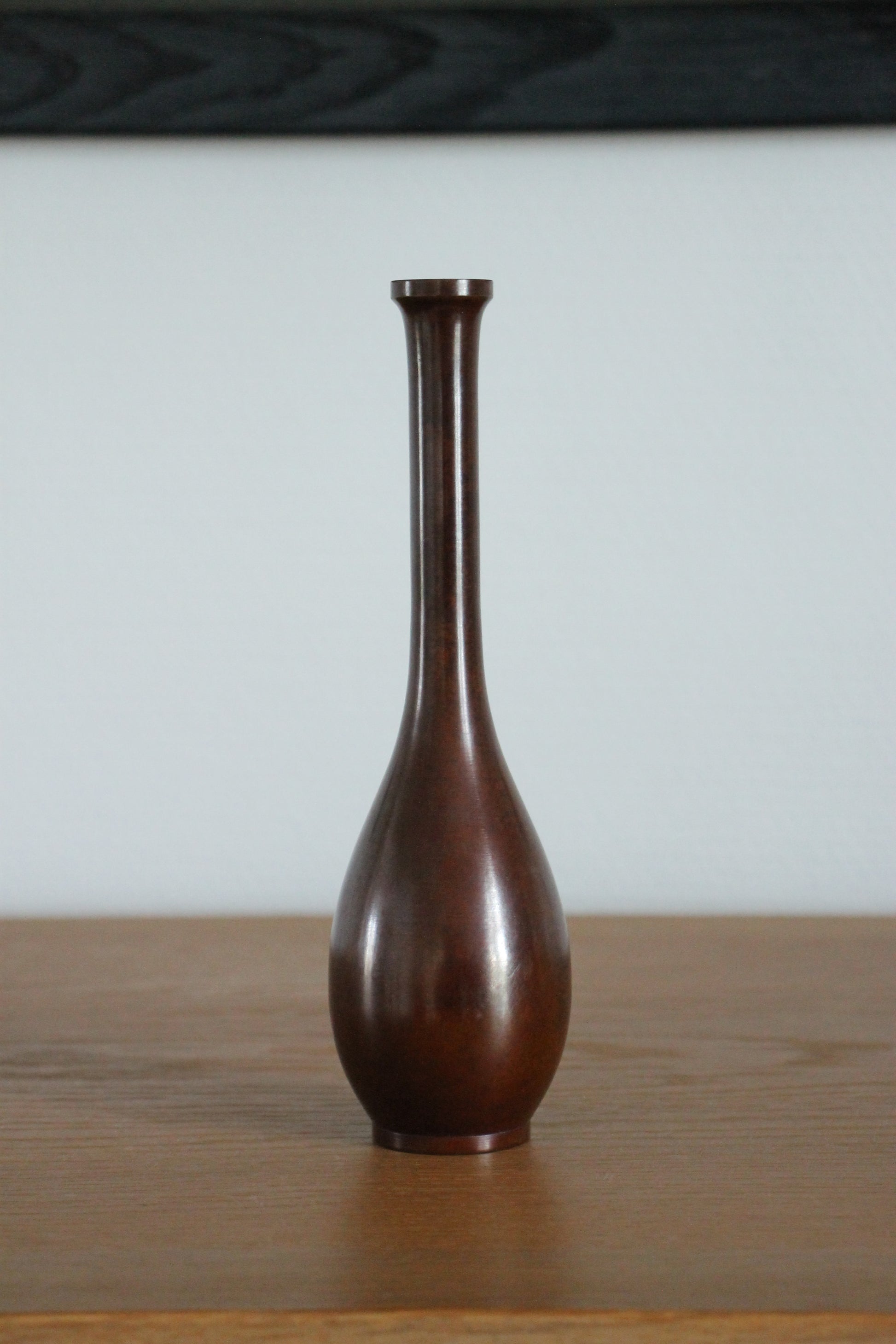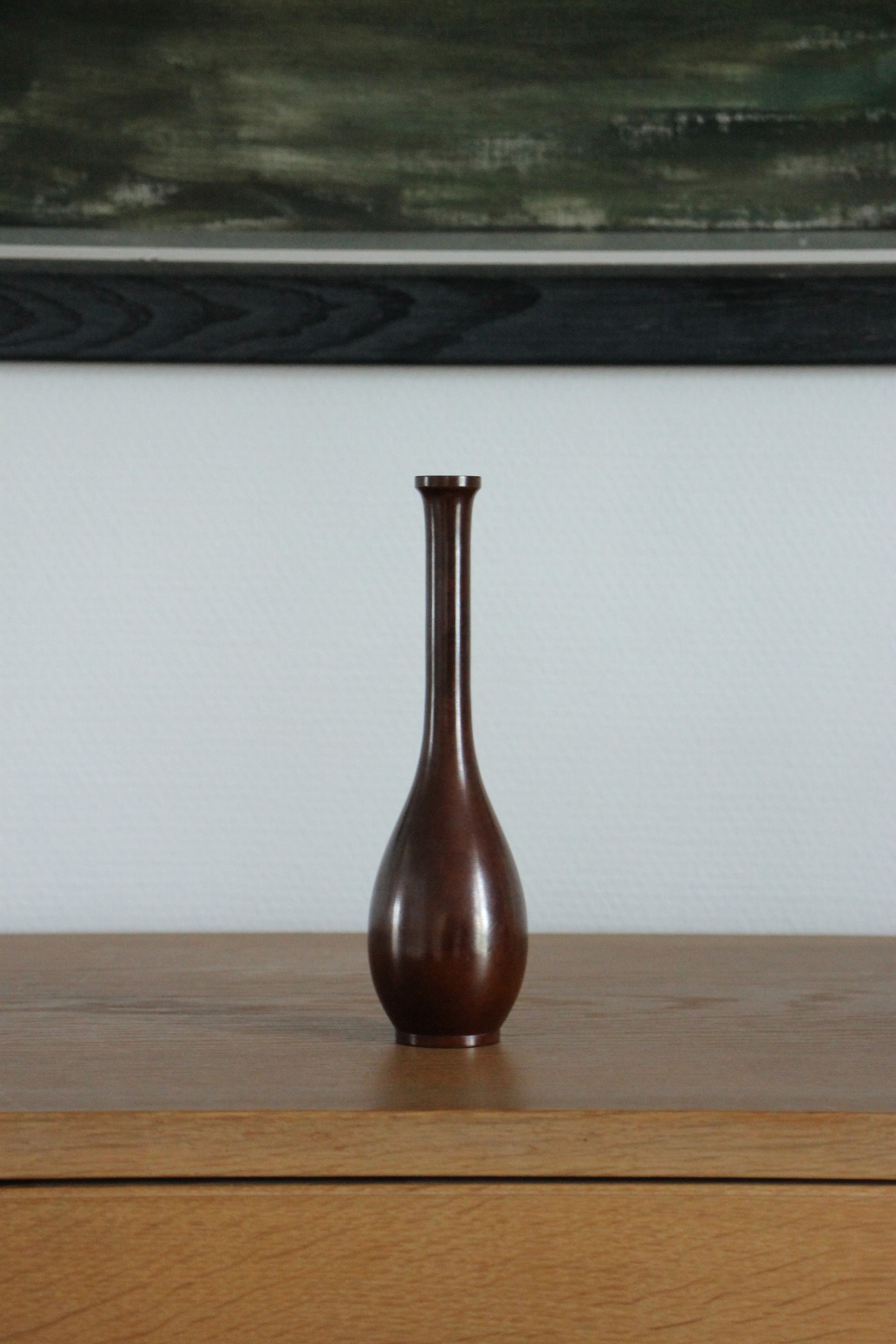 A vintage Japanese bronze vase by Nakajima Yasumi II (1905–1986). The vase has a tall, slender neck rising from a rounded body with a small circular foot. The surface shows a deep brown patina with subtle tonal variation.